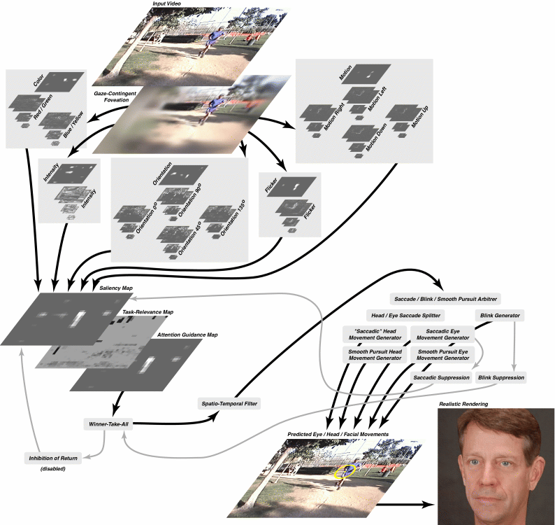 has since then been extended in many directions, including to include eye and head movement animation, as discussed in Itti, Dhavale & Pighin, Proc. SPIE, 2003 and summarized below: