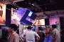| The Nintendo and Sony booths can be seen below, with aerial views of heavy traffic and gaming stations. While both consoles were designed to appeal to the serious gamer, the approach taken by each was dramatically different. PlayStation had more of a lounge scene setting, equipped with large double-sided projection screens on clear glass panels, glowing plastic sofas and satellite speakers behind the sofas for the full gaming experience of the showcased games. Nintendo, on the opposite end, had several intimate hidden coves with only two essential things needed to play the showcased game: a large flat-screen and the gaming device dedicated to the showcased game. Both consoles provided representatives to answer questions and included periodic games to entice visitors. |