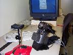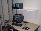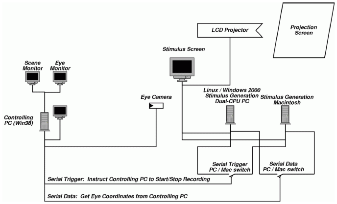 The USC Neuroscience Graduate Program (NGP) owns a human video-based eye-tracking system, installed in the Hedco Neuroscience Building, room HNB-13b. The eye-tracker is an ISCAN 240Hz video-based machine: an infrared light source illuminates the subject's right eye, and a high-speed video camera records a close-up movie of the eye; two features are tracked in real-time on the video sequence: the outline of the pupil and the specular reflection of the light source onto the cornea. The camera is mounted onto a motorized precision pan/tilt head so that optimal viewpoint can be easily obtained for every subject. This setup allows the controlling computer to compute the (x, y) coordinates of the point of fixation, but with those coordinates being in some referential that is linked to the eye camera. To obtain eye coordinates relative to the referential of the stimulus being shown to the subject, a calibration procedure is used to establish a mapping between stimulus referential and camera referential. |